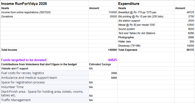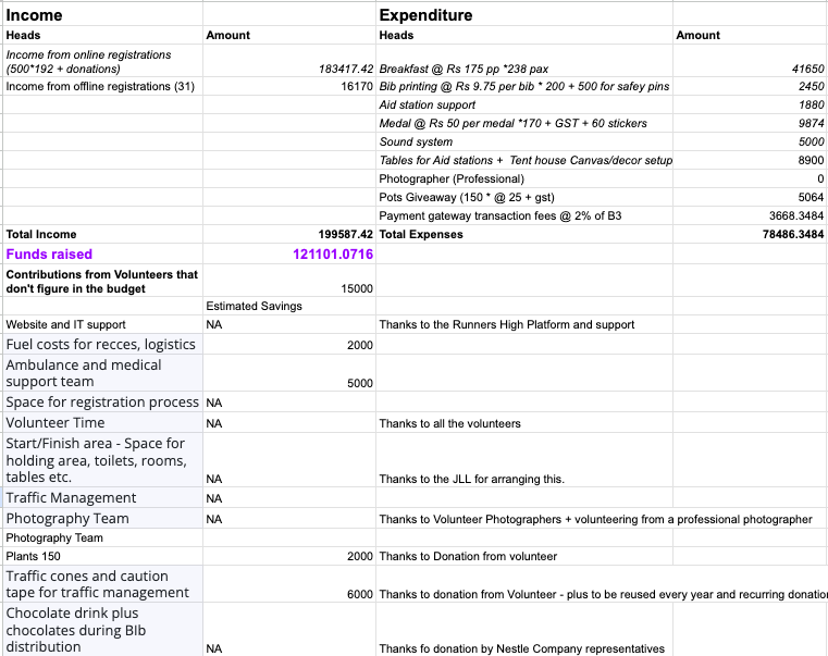 A budget document with estimated expenses and registration income for the event will be put up on the event website. After the event along with the ‘thank you’ email we will send across actuals of expenditure and income for the event to all runners and also put it up on the website. Every expense will be supported by a receipt. Every contribution/donation will also be supported by a receipt. By the next year, when we organize the next edition, we will give an update on the funds raised in the previous year. You can always contact us to see how the funds were used.